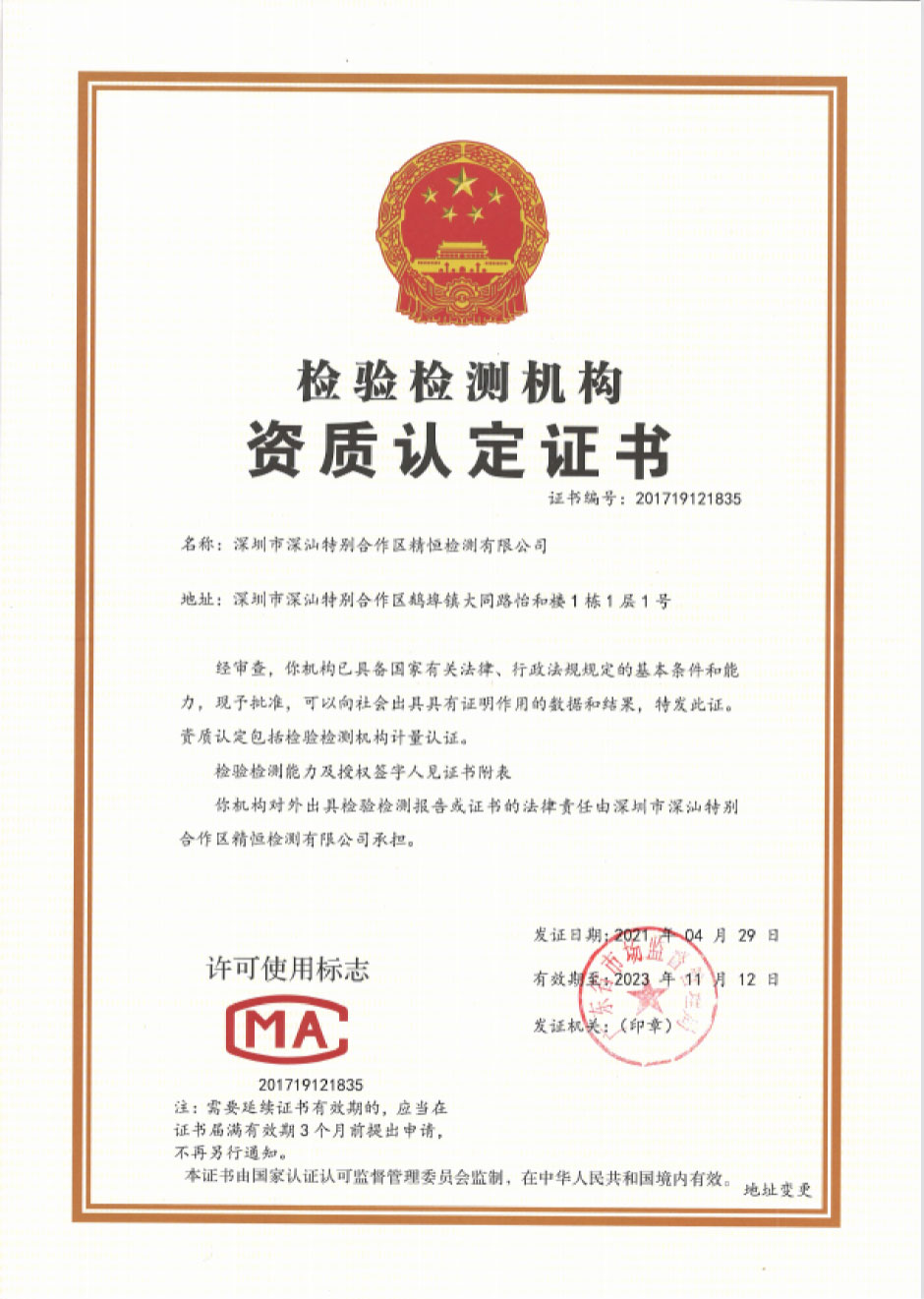 深圳市深汕特别合作区精恒检测有限公司前身为深汕特别合作区精恒工程检验有限公司,由华体会体育-华体会(中国)-华体会(中国) 控股投资,于二零一四年十二月在汕尾市住房和城乡建设局备案(证书号:JCJG-2015003),从事检验检测工作,二零一五年深汕特别合作区招商引资,为了更好的服务于深汕特别合作区,方便于建设管理者严把建设工程质量关。根据国家相关法律、法规要求,当地也必须有国家认可的检验检测机构,作为一个深圳市检测经验丰富的检测机构,经汕尾市政府、深汕特别合作区管理委员会等领导审批后,作为第二批进驻深汕特别合作区企业。由于建设发展的需要,本公司于二零二一年十月二十七日更名为深圳市深汕特别合作区精恒检测有限公司。